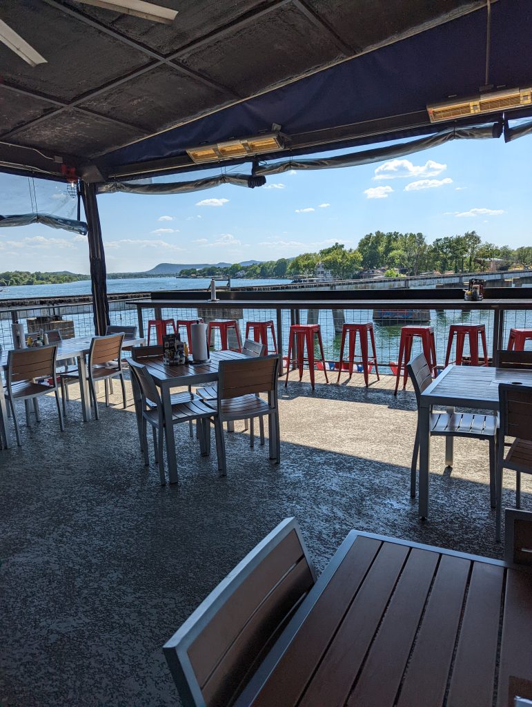 The outdoor tables sit close enough to the water that you can hear it splash along the shoreline. It’s the kind of place where conversation flows easily, where nothing feels rushed.