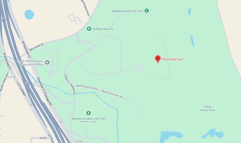 Prairie Dog Town sits inside Mackenzie Park on the north side of Lubbock, accessible from 4th Street and Interstate 27, overlooking Meadowbrook Golf Course.