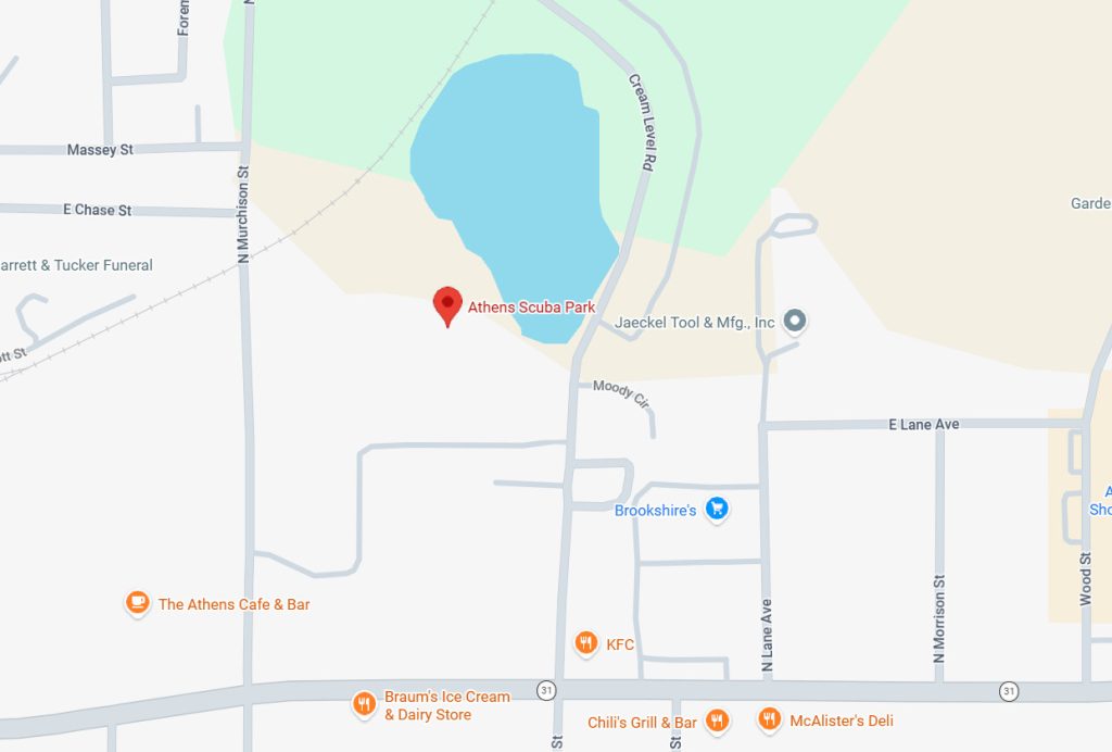 Athens Scuba Park sits at 500 N Murchison Street in Athens, Texas, just half a mile from the charming town square.