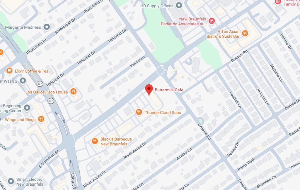 Buttermilk Cafe sits at 1324 East Common Street in New Braunfels, along one of the town’s main thoroughfares.