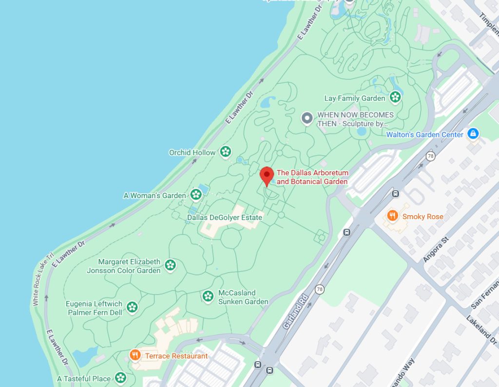 The arboretum occupies the southeastern shore of White Rock Lake at 8525 Garland Road in East Dallas, about 15 minutes from downtown.