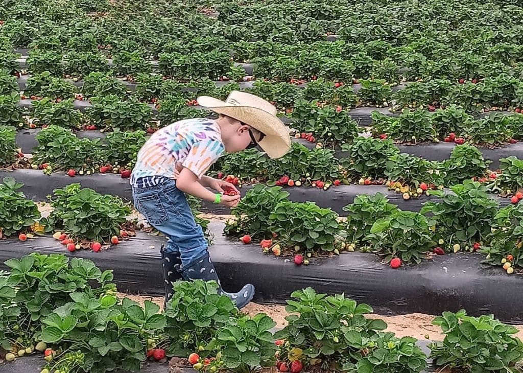 Finally she found what she was looking for, the perfect strawberry. A big red jewel of a berry. “Mom,” she yells, full of excitement, waving her hands. “I got one! I got a magic strawberry!” Three moms look up smiling. This is Saturday morning during spring strawberry picking season at Atkinson Farms in Spring, Texas.