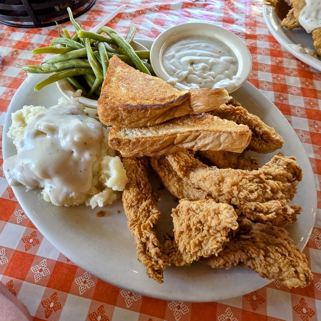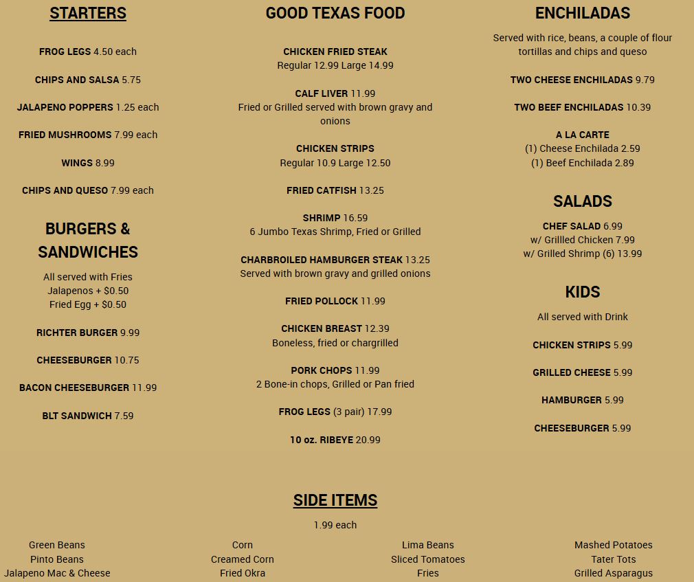 Chicken fried steak in the $12–15 range shines, because it always does in Texas, and Richter’s version holds its own, crispy on the outside, tender underneath, covered in gravy that doesn’t hold back, earning its spot on the table.