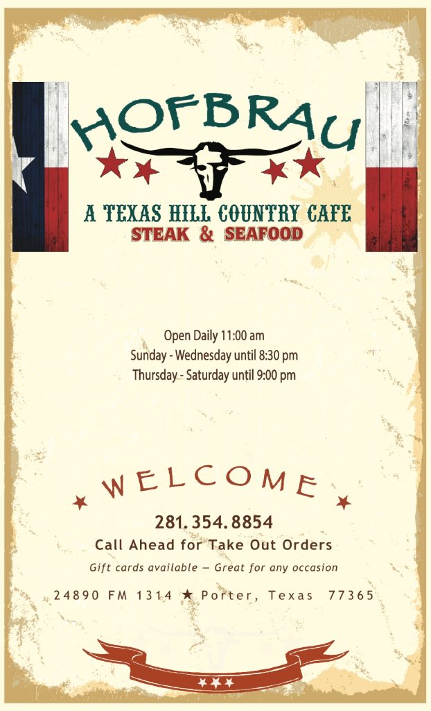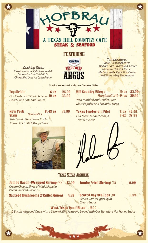 Nostalgia … the Lone Star way. That’s Hofbrau Steakhouse, from the first red checkered tablecloth you smooth down with your palm to the last shot you sneak at a road sign nailed neatly on the wall as you head out the door.