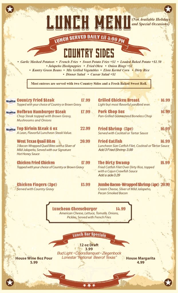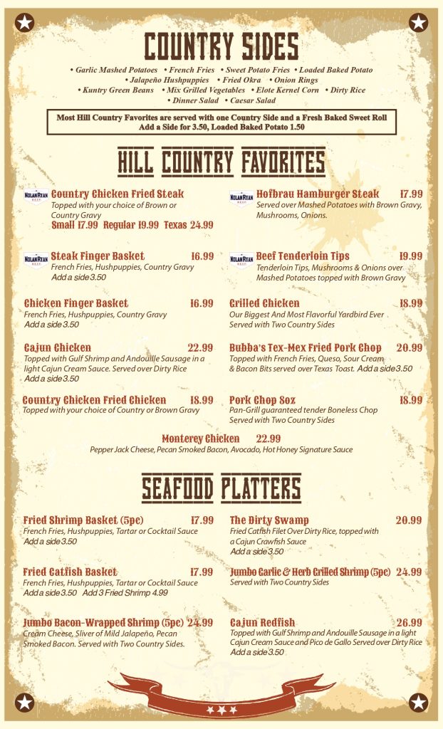 Chicken dishes, seafood selections, a few alternatives to keep everyone happy without pulling y’all too far away from a classic Texas style.
