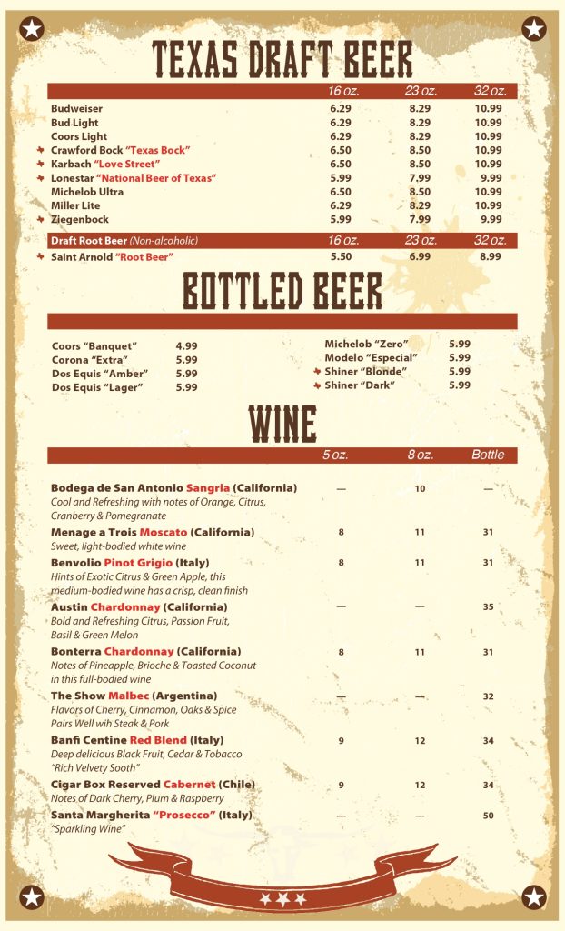 Texas Draft Beer, Bottled Beer, and Wine Menu: