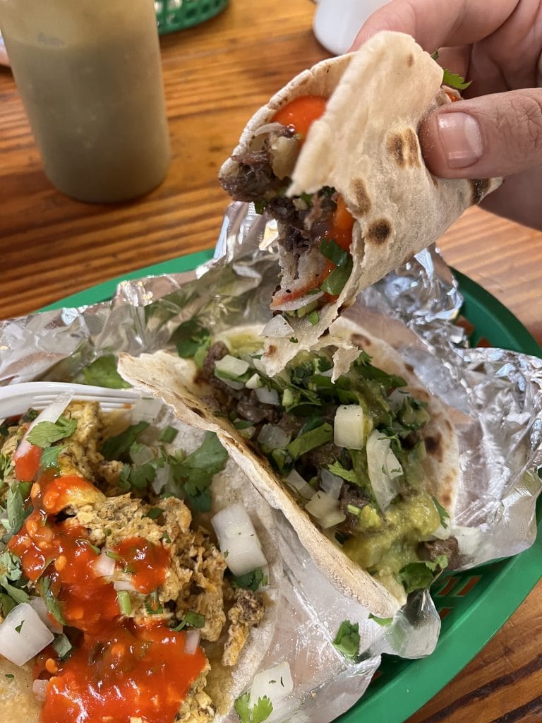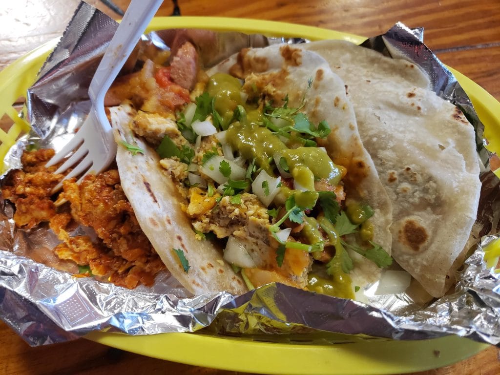 The powder on the tortillas. The rich flavor of the meat. Rustle of foil as you pick up your first taco. Vibrant colors all around you, as you sit and enjoy your breakfast.