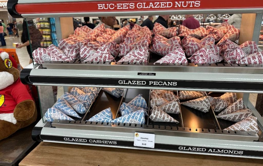 If your sweet took is aching, Buc-ees has you covered. You’ll find bakery display cases filled with cookies or freshly made fudge. On every trip, I grab a bag of the warm, candied pecans in a cone-shaped wrapper.