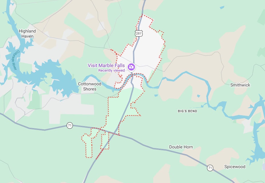 Marble Falls sits in Burnet County in Central Texas, about 50 miles northwest of downtown Austin and 85 miles north of San Antonio.