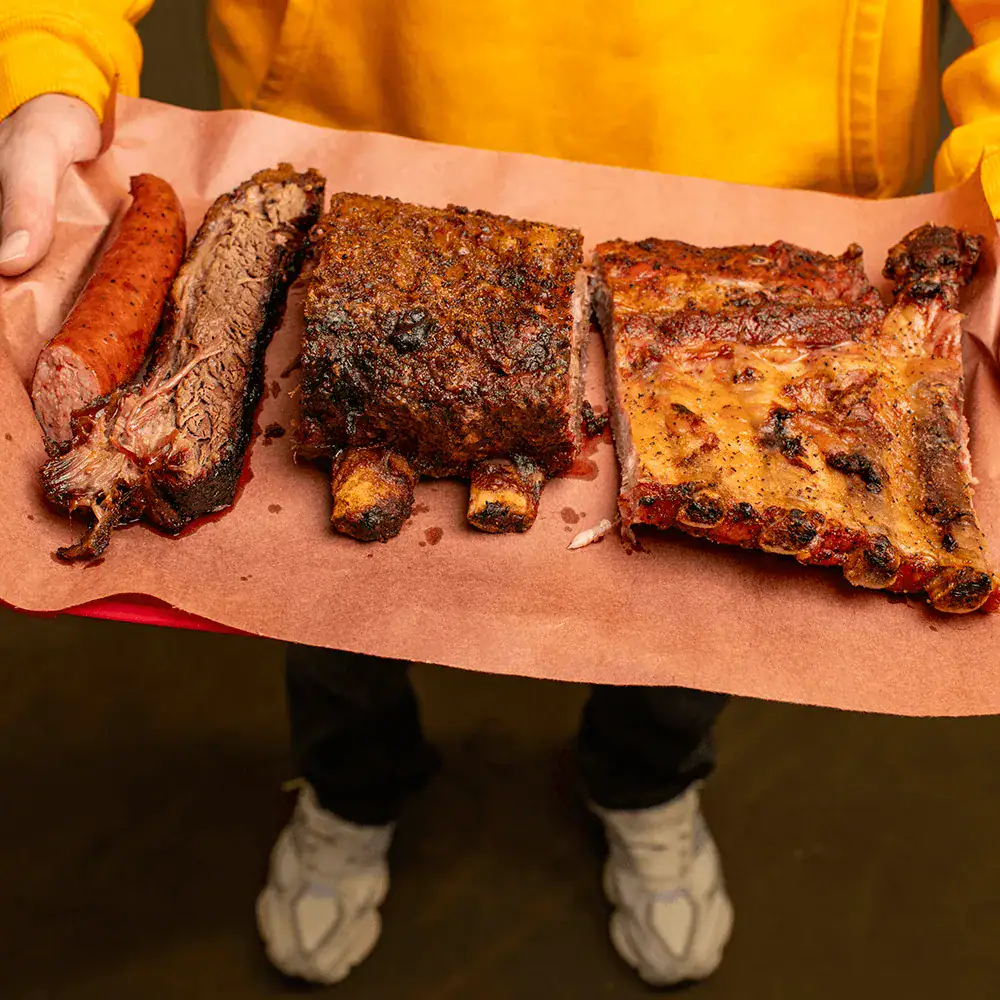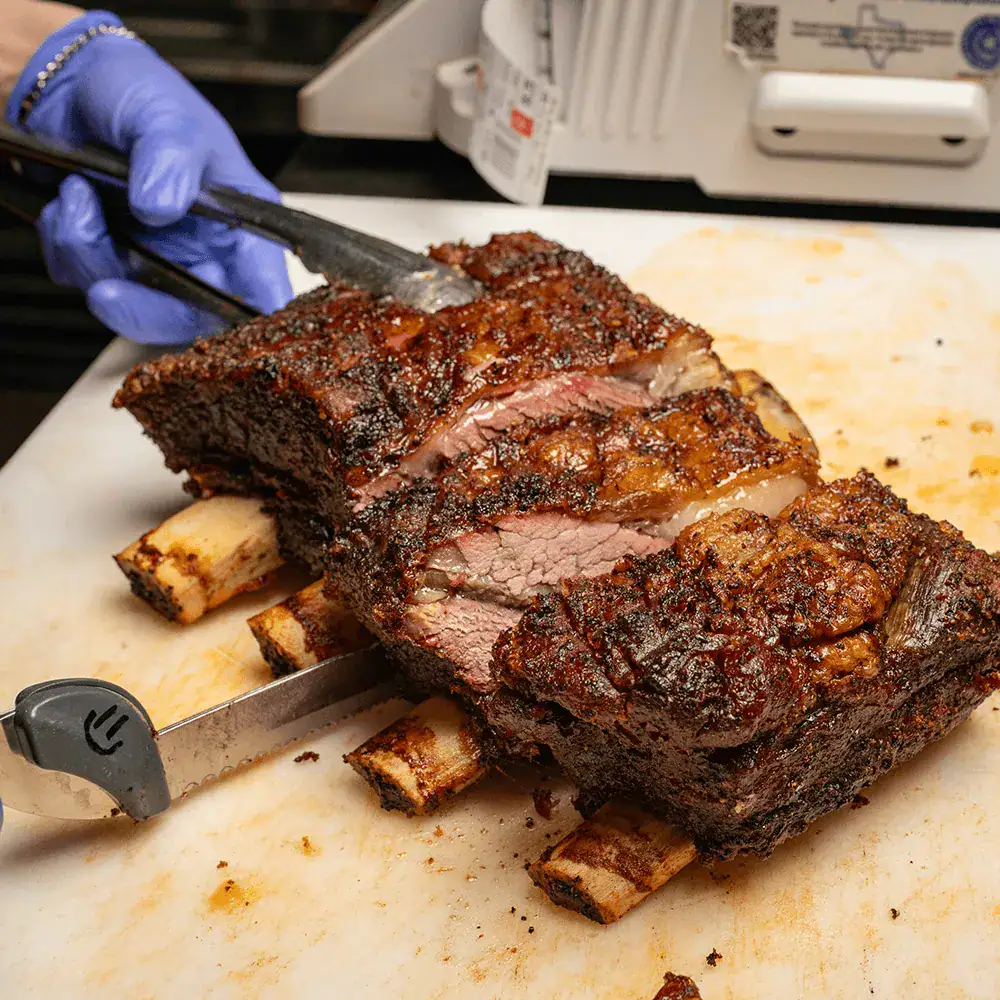 They have about 14 different cuts of beef, pork, and poultry on the pit every day. One of their popular items is the Big Chop, which includes signature beef ribs. Another crowd favorite is the Texas Trinity, with brisket, sausage, and pork ribs. They also have steaks, if you’re craving one.