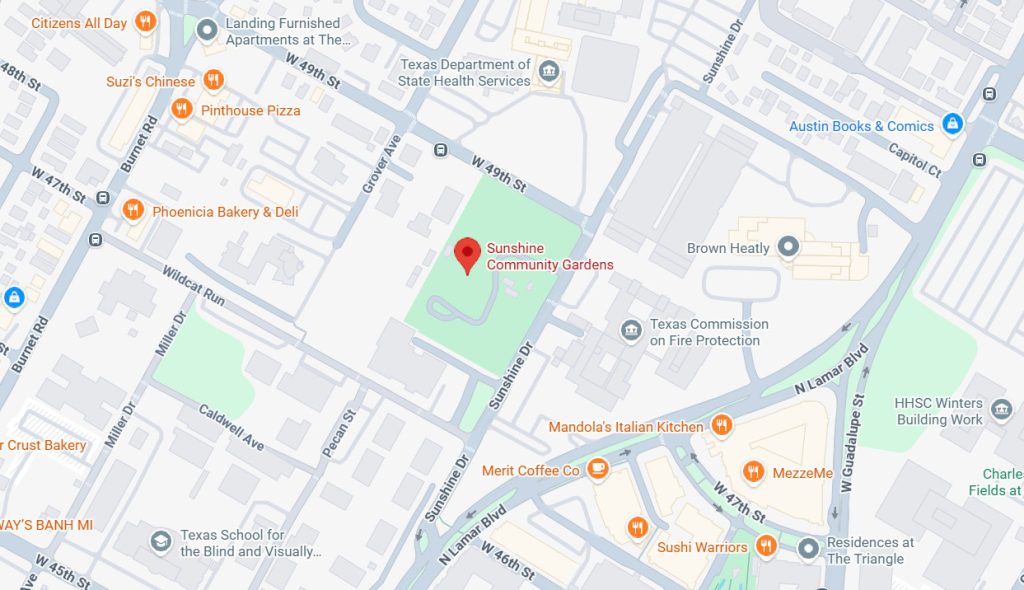 Sunshine Community Gardens sits on Sunshine Drive near the intersection of Lamar Boulevard and 45th Street—technically within the Brentwood neighborhood but serving gardeners from across Austin.