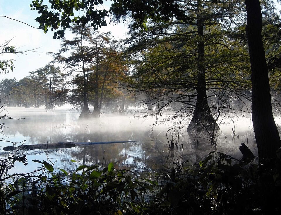 Mist rises from the water as day dawns at Martin Dies, Jr. State Park. (Photo credit: Wikimedia Commons)