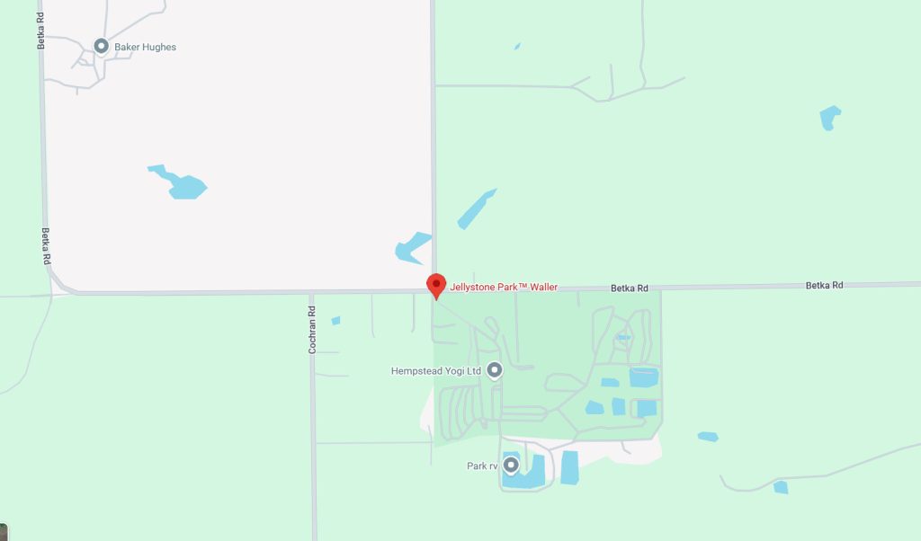 Jellystone Park Waller occupies a stretch of countryside along Betka Road, surrounded by the open pastures and scattered oaks that characterize this part of southeast Texas.