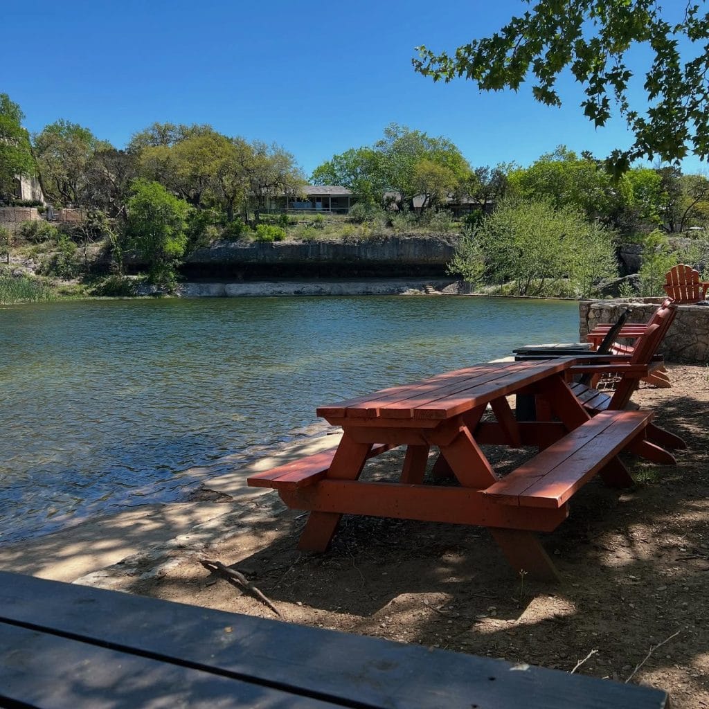 What it gives you is something simpler: clear spring-fed water, cypress trees older than Texas itself, a limestone formation called Eagle Rock that the creek spent millennia carving, and a cold beer waiting when you climb out.