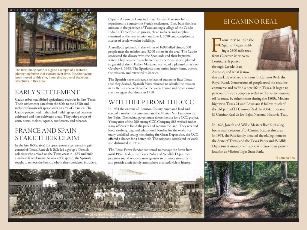 In the 1600s, the Spanish traveled 2,500 miles from Mexico to Louisiana, passing through this very park, on a route called El Camino Real: The Royal Road. In the early 2000s, this road became known as El Camino Real de los Tejas National Historic Trail.