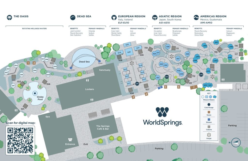 WorldSprings is set up with multiple pools grouped, each one modeled after minerals from different regions around the world, including the Dead Sea, Italy, Iceland, Japan, South Korea, Mexico, and Guatemala.