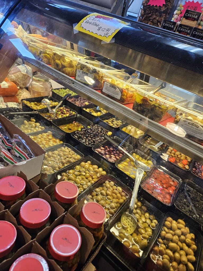 Here, you’ll discover many of the most iconic ingredients of Italian cooking, including balsamic vinegar, olives, peppers, cheese, pasta, and sauces. Try Jimmy’s exclusive olive oil, Borghese — it has a real kick. I suggest dipping bread in it.