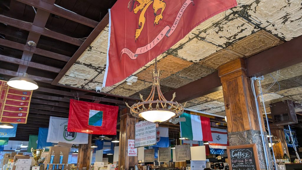 There’s a cheeriness to the brand: red square tiles in neat rows along the roof, “Fine Italian Imports & Deli” in white letters on a green-and-red sign above the door, “Italian Sausage” in a large artistic font on the outside windows, and behind the counter, the same bushy eyebrows and long, sharp noses of the DiCarlos.